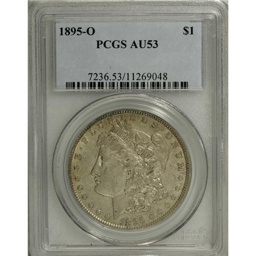 <B>1895-O S$1 AU53 PCGS.</B></I> Traces of luster appear in the protected areas, and wisps of cobalt-blue, lavender, and gold-tan color occupy peripheral areas on the reverse. The design features are well impressed, except for the usual softness in the hair over Liberty's ear. Both sides are relatively clean.<BR><BR><b>Shipping:</b> Coins & Currency (<a target="_blank" href="http://www.heritageauctions.com/common/shipping.php">view shipping information</a>)