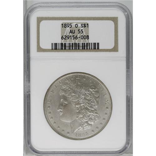 <B>1895-O<img border='0' src='http://www.heritagecoins.com/images/star.gif' width=10 height=10>$1> AU55 NGC.</B></I> This is a splendid near-Mint example with light pewter surfaces and slightly reflective surfaces. Traces of wear are visible on the highest points of each side, and yet, nearly full luster remains visible.