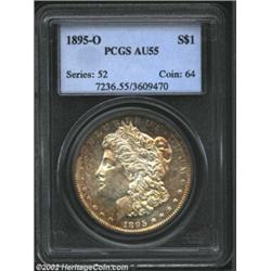 1895-O S$1 AU55 PCGS. Extremely well struck for this key New Orleans issue, with generous amounts of semi-reflective luster in the fields, being almost complete, in fact, on the reverse. Coppery-gold accents are more noticeably dispersed on the obverse.From The New York "Eye Appeal" Collection. Important notice: We expect to be auctioning lots at the rate of 200-250 per hour. Sometimes eBay Premier live bid software cannot keep up with that pace, so we strongly recommend that you place a realistic proxy bid now as insurance to avoid disappointment. Also please note that all Heritage/CAA lots purchased through eBay Premier carry a 20% Buyer's Premium. Please make sure you read the Terms and Conditions.