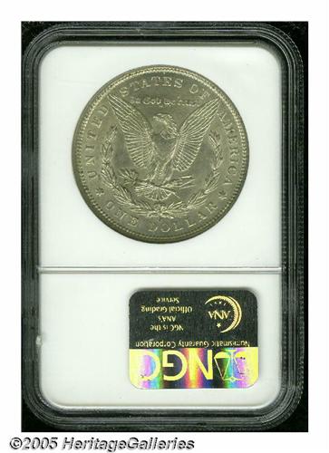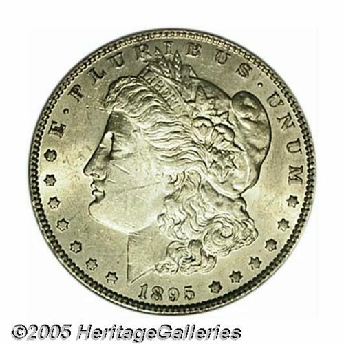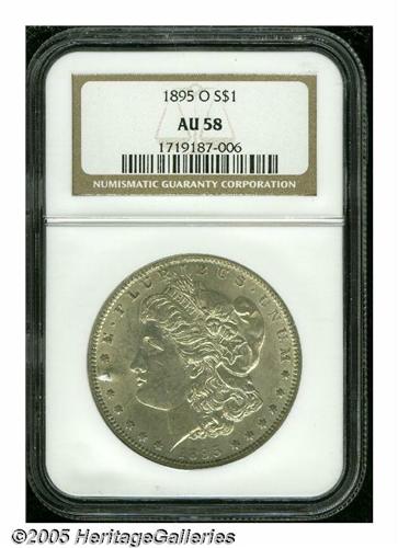 <B>1895-O<S$1> AU58 NGC.</B></I> Satiny and untoned with just the slightest break in luster over the central motifs. Most signs of contact can be found on and to the left of Liberty's face. The 1895-O is the scarcest of the New Orleans Morgan Dollars in all grades and, while occasionally seen in the presently offered condition, is a true rarity in Mint State.