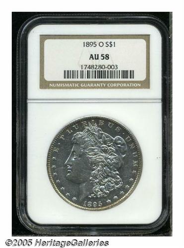 <B>1895-O<S$1> AU58 NGC.</B></I> The 1895-O is one of the most highly respected condition rarities in the Morgan Dollar series. For the collector, a pleasing, problem-free AU58 such as this makes a lot of sense from the standpoint of value. A strict Mint State example would cost multiples of what this piece will bring and it might not have cleaner surfaces and just slightly better luster characteristics. Mostly brilliant throughout, there is just the slightest trace of rub over the highpoints, and the luster is a bit thin in the fields but really quite good for an 1895-O.