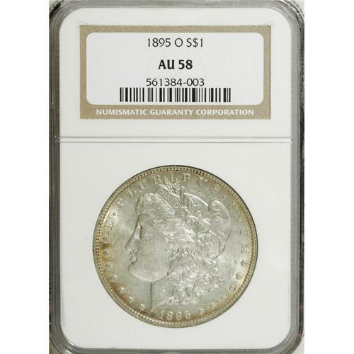 <B>1895-O S$1 AU58 NGC.</B></I> This New Orleans issue usually exhibits a below-average to average strike; sharply defined coins are elusive. Indeed, David Bowers (2005) contends that: "Cherrypicking is encouraged, not easy to do with 1895-O as Mint State pieces are quite elusive." Bowers' comments notwithstanding, we offer here a wonderful high-end AU example that exhibits above-average delineation on the design features, and great luster for a lightly circulated coin. Whispers of gold-tan patination run along the borders, especially on the obverse.<BR><BR><b>Shipping:</b> Coins & Currency (<a target="_blank" href="http://www.heritageauctions.com/common/shipping.php">view shipping information</a>)