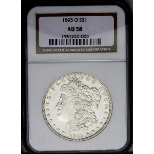 <B>1895-O<img border='0' src='http://www.heritagecoins.com/images/star.gif' width=10 height=10>$1> AU58 NGC.</B></I> This lightly circulated example exhibits superficial, even wear on the highpoints of either side, along with a relatively small number of surface abrasions and a couple of wispy hairlines. The luster is slightly subdued, as expected for an AU coin, and there is a hint of golden color overall. A scarce date in this grade and prohibitively rare in Mint State. <BR><BR><B>Important notice:</B> Heritage usually auctions material at the rate of 200-250 lots per hour. On some occasions eBay Live bid software or the Internet may not be able to keep up with the pace of the auction. We recommend placing a realistic absentee bid now as insurance to avoid disappointment. Occasionally the auctioneer may eliminate or reject an eBay Live bid, and the auctioneer may also reopen a lot after the close of the eBay live bidding (usually because we missed an audience bid), and may reject your bid even if it shows you as the winning bidder. By bidding via eBay Live, you agree that Heritage may award the lot to another bidder at its sole discretion under the circumstances described above or any other reasonable circumstances. Since eBay bids are not shown to us until we open the lot on the floor, we treat those bids just like floor bids. In most cases the floor responds before the eBay bid is presented to us, due to Internet lag time, so for consistency we have made it a policy that floor bids are always considered first over tie eBay live bids. Also please note that all Heritage lots purchased through eBay Live carry a 20% Buyer's Premium. Please make sure you read the Terms and Conditions before you bid. This lot is being auctioned in conjunction with a live floor auction by Heritage Galleries & Auctioneers. All final auction and invoice information will be supplied by Heritage Galleries & Auctioneers, and all other information should be considered preliminary. Lot:3688 <BR><BR><B>Winning Notification and Billing:</B> After the FINAL session in this auction is complete, Heritage will send e-mail and snail mail invoices. This process normally takes several days. All final auction and invoice information will be supplied by Heritage Galleries & Auctioneers, and all other information should be considered preliminary. <BR><BR>This auction will be conducted on a live auction floor and over the Internet through eBay Live. If you choose to place an absentee bid, please take a moment to <font color='#0000ff'><u><a href='http://pages.ebay.com/liveauctions/help/before/laabsentee.html'>learn how eBay Live absentee bidding works</a></u></font><font color='#000000'>