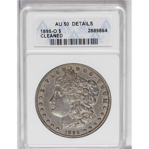 <B>1895-O<img border='0' src='http://www.heritagecoins.com/images/star.gif' width=10 height=10>$1>--Cleaned--ANACS. AU50 Details.</B></I> Bright from a mild cleaning, and retoned in gold, lime, and sky-blue hues. A few thin marks are noted on the field near the eagle. The 1895-O is the scarcest of the O-mint Morgan dollars.