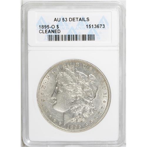 <B>1895-O<img border='0' src='http://www.heritagecoins.com/images/star.gif' width=10 height=10>$1>--Cleaned--ANACS. AU53 Details.</B></I> Lightly worn with the usual strike and significant original luster at the periphery. The tin-gray surfaces have numerous hairlines.