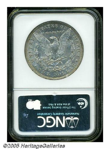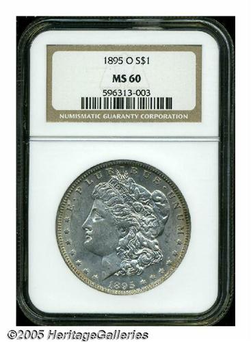 <B>1895-O<S$1> MS60 NGC.</B></I> A bit softly struck, as is typical for this conditionally rare issue, with a satiny, golden-gray finish overall. The 1895-O has long been regarded as one of the stoppers in the Morgan Dollar series in Uncirculated condition. Typically struck for an O-mint Dollar, the obverse shows the scuffiness one would expect from a coin of this grade. A couple of heavier marks are noted at the base of Liberty's neck. An important opportunity for the specialist in this immensely popular series.