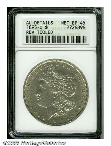 <B>1895-O<S$1>--Reverse Tooled--ANACS. AU Details, Net XF45.</B></I> A bit of patchy and rather crude tooling is noticed to the right of the eagle's head. Untoned with much surviving luster.