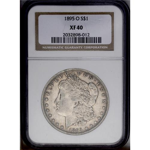<B>1895-O<img border='0' src='http://www.heritagecoins.com/images/star.gif' width=10 height=10>$1> XF40 NGC.</B></I> Light to medium gray color blankets each side. A few small contact marks are apparent on Liberty's face. This somewhat scarce date will fit comfortably into a circulated Morgan dollar set. <BR><BR><B>Important notice:</B> Heritage usually auctions material at the rate of 200-250 lots per hour. On some occasions eBay Live bid software or the Internet may not be able to keep up with the pace of the auction. We recommend placing a realistic absentee bid now as insurance to avoid disappointment. Occasionally the auctioneer may eliminate or reject an eBay Live bid, and the auctioneer may also reopen a lot after the close of the eBay live bidding (usually because we missed an audience bid), and may reject your bid even if it shows you as the winning bidder. By bidding via eBay Live, you agree that Heritage may award the lot to another bidder at its sole discretion under the circumstances described above or any other reasonable circumstances. Since eBay bids are not shown to us until we open the lot on the floor, we treat those bids just like floor bids. In most cases the floor responds before the eBay bid is presented to us, due to Internet lag time, so for consistency we have made it a policy that floor bids are always considered first over tie eBay live bids. Also please note that all Heritage lots purchased through eBay Live carry a 20% Buyer's Premium. Please make sure you read the Terms and Conditions before you bid. This lot is being auctioned in conjunction with a live floor auction by Heritage Galleries & Auctioneers. All final auction and invoice information will be supplied by Heritage Galleries & Auctioneers, and all other information should be considered preliminary. Lot:3676 <BR><BR><B>Winning Notification and Billing:</B> After the FINAL session in this auction is complete, Heritage will send e-mail and snail mail invoices. This process normally takes several days. All final auction and invoice information will be supplied by Heritage Galleries & Auctioneers, and all other information should be considered preliminary. <BR><BR>This auction will be conducted on a live auction floor and over the Internet through eBay Live. If you choose to place an absentee bid, please take a moment to <font color='#0000ff'><u><a href='http://pages.ebay.com/liveauctions/help/before/laabsentee.html'>learn how eBay Live absentee bidding works</a></u></font><font color='#000000'>