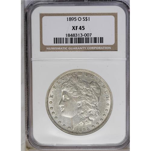 <B>1895-O<img border='0' src='http://www.heritagecoins.com/images/star.gif' width=10 height=10>$1> XF45 NGC.</B></I> Light to moderate wear is well-distributed over the still-lustrous gold-gray surfaces. An appealing example from an original mintage of 450,000 pieces.<BR><I>From The Catfish Creek Collection.</B></I>