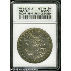 <B>1895<img border='0' src='http://www.heritagecoins.com/images/star.gif' width=10 height=10>$1 --Repaired, Cleaned--ANACS. AU Details, Net PR30.</B></I> The cheek and left obverse field have been carefully smoothed on the present specimen, and both sides are cloudy due to wispy hairlines. Nonetheless, the piece has since acquired attractive chestnut patina throughout the borders, and original luster remains present across much of the devices. The key date to the Morgan Dollar series, the 1895 is available only in proof format, and the mintage of 880 pieces is many times fewer than the number of collectors attempting a complete set. Lot:10664