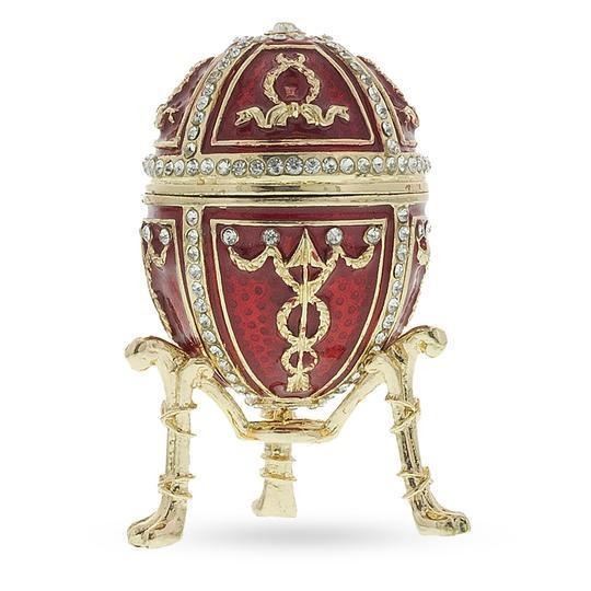1895 Rosebud Royal Russian Egg with Clock Surprise 2.9 Inches Tall x 1.7 Inches Wide 7.366 cm Tall x 4.318 cm Wide Enameled Gold Plated Pewter Battery Operated Clock Hand Painted Gift Boxed This hand-painted sparkling egg is adorned with a high-polished red enamel with golden trim. It is decorated with light pink enameled roses and green leaves. This beauty stands on a golden stand. The egg opens on a hinge and closes shut with a magnet, to keep the box securely shut. The piece comes in a beautiful gift box. Egg History: The egg was created by Carl Peter's workmaster, Henrik Winstrom and is crafted of gold, green and pink enamel in various shades, portrait diamonds, rose-cut diamonds, and satin lining. This egg is enameled in translucent pale green and latticed with rose-cut diamonds and decorated with opaque light and dark pink enamel roses and emerald green leaves.