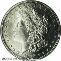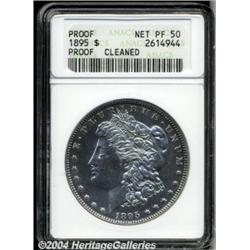 <B>1895<S$1>--Cleaned--ANACS. Net PR50.</B></I> The 1895 Morgan Dollar needs no real introduction. It has often been referred to as the "king" of the Morgan dollars and who could really argue? The 12,000 business strikes reportedly struck were perhaps among the many millions of silver dollars melted under the provisions of the Pittman Act in 1918. Today, only proofs are known to exist and there were just 880 pieces struck, far fewer in number than is sufficient to satisfy the demand from the thousands of collectors of this popular series. A crisply struck specimen with frosty devices and steel-blue fields. Faintly but not obtrusively hairlined, the relatively mild cleaning makes the present piece more affordable to those among us who can only dream of possessing a Gem. <BR><BR><B>Important notice:</B> Heritage usually auctions material at the rate of 200-250 lots per hour. On some occasions eBay Live bid software or the Internet may not be able to keep up with the pace of the auction. We recommend placing a realistic absentee bid now as insurance to avoid disappointment. Occasionally the auctioneer may eliminate or reject an eBay Live bid, and the auctioneer may also reopen a lot after the close of the eBay live bidding (usually because we missed an audience bid), and may reject your bid even if it shows you as the winning bidder. By bidding via eBay Live, you agree that Heritage may award the lot to another bidder at its sole discretion under the circumstances described above or any other reasonable circumstances. Since eBay bids are not shown to us until we open the lot on the floor, we treat those bids just like floor bids. In most cases the floor responds before the eBay bid is presented to us, due to Internet lag time, so for consistency we have made it a policy that floor bids are always considered first over tie eBay live bids. Also please note that all Heritage lots purchased through eBay Live carry a 20% Buyer's Premium. Please make sure you read the Terms and Conditions before you bid. </span></font></tr></table></td></tr></table>