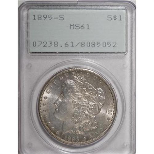 <B>1895-S $1 MS61 PCGS.</B></I> The most easily collectible Mint State Morgan dated 1895, the San Francisco issue had a moderately low mintage of 400,000 coins, far more than the proof-only Philadelphia dollar, and only slightly less than the New Orleans production of 450,000 dollars. Housed in a first-generation PCGS holder, this piece is fully brilliant with full silver luster and sharp design features. A few scattered marks are evident on each side as expected, but the overall appearance is highly desirable.<BR><BR><B>Coin Engraver:</B> George T. Morgan<BR><BR><b>Shipping:</b> Coins & Currency (<a target="_blank" href="http://www.heritageauctions.com/common/shipping.php">view shipping information</a>)
