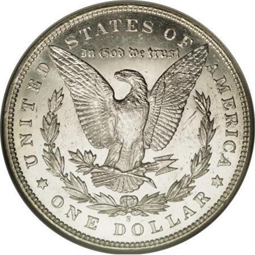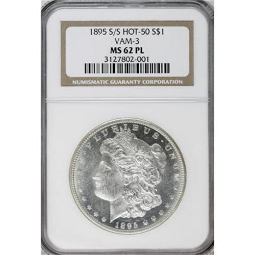 <B>1895-S $1 MS62 Prooflike NGC.</B></I> VAM-4. S over Horizontal S. A Top 100 Variety. Incorrectly listed as VAM-3 on the NGC holder. A fully brilliant and sharply detailed Mint State example with mirrored fields around lustrous devices on both sides. Doubled mintmark with an artifact of the original mintmark left of the upper curve of the final S.<BR><BR><b>Shipping:</b> Coins & Currency (<a target="_blank" href="http://www.heritageauctions.com/common/shipping.php">view shipping information</a>)