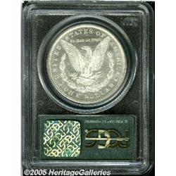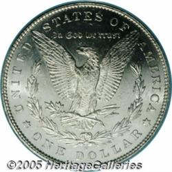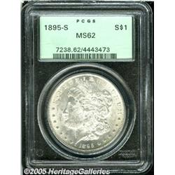 <B>1895-S<img border='0' src='http://www.heritagecoins.com/images/star.gif' width=10 height=10>$1 MS62 PCGS.</B></I> Fully brilliant with frosty silver luster, the surfaces are entirely untoned. The reverse fields have light reflectivity, although this is clearly not a candidate for the prooflike designation. It is a desirable Mint State example with excellent eye appeal, despite numerous tiny surface marks.
