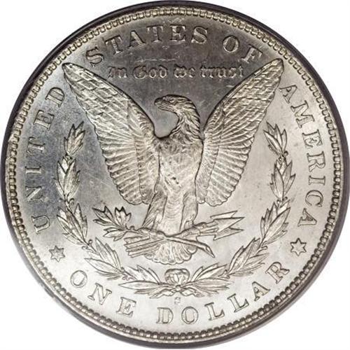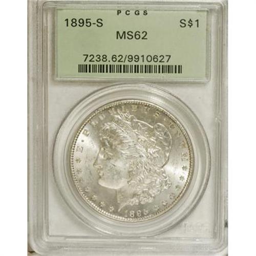 <B>1895-S $1 MS62 PCGS.</B></I> 1895-S Mint State coins are usually heavily bagmarked. Indeed, David Bowers (2006) writes that: " ... the booby prize for bagmarking should go to the 1895-S or the 1893-CC; it's probably a tossup." The MS62 specimen in this lot displays lustrous surfaces that are quite well preserved on the reverse; a milling mark on Liberty's cheek (a focal area) is likely all that precludes a higher grade on this coin. The design elements are well impressed, and the surfaces nearly untoned, save for a couple hints of color on the obverse. Housed in a green label holder.<BR><BR><b>Shipping:</b> Coins & Currency (<a target="_blank" href="http://www.heritageauctions.com/common/shipping.php">view shipping information</a>)
