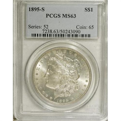 <B>1895-S $1 MS63 PCGS.</B></I> A satiny Select silver dollar whose surprisingly smooth surfaces offer faint gold toning. Light roller marks here and there are strictly of mint origin. The 1895-S is the key to a <I>date</B></I> set of Morgan dollars, since the 1895 is proof-only and the 1895-O is even scarcer than the 1895-S, despite a slightly higher mintage.<BR><BR><b>Shipping:</b> Coins & Currency (<a target="_blank" href="http://www.heritageauctions.com/common/shipping.php">view shipping information</a>)