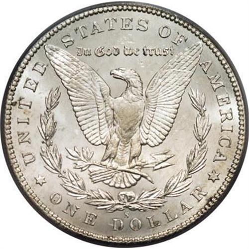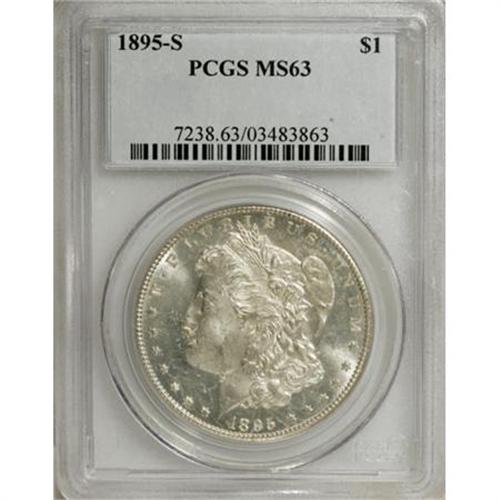 <B>1895-S $1 MS63 PCGS.</B></I> This is an exceptional 1895-S dollar in that most Mint State coins are heavily bagmarked (David Bowers, 2006). Only a few minor luster grazes just barely preclude the next highest grade for this MS63 coin. The surfaces are partially prooflike, essentially untoned, and exhibit generally well struck devices. Light roller marks are visible on Liberty's cheek.<BR><BR><B>Coin Engraver:</B> George T. Morgan<BR><BR><b>Shipping:</b> Coins & Currency (<a target="_blank" href="http://www.heritageauctions.com/common/shipping.php">view shipping information</a>)