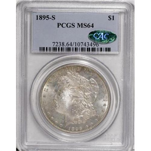 <B>1895-S $1 MS64 PCGS. CAC.</B></I> The bright surfaces have a semi-prooflike sheen, as faint striae are noted in the fields. Light caramel-gold accents occur near the obverse periphery. The fields are well preserved, and cheek has only faint contact. A much better date in all grades. PCGS has only graded 27 examples finer (11/07).<BR><BR><B>Coin Engraver:</B> George T. Morgan<BR><BR><b>Shipping:</b> Coins & Currency (<a target="_blank" href="http://www.heritageauctions.com/common/shipping.php">view shipping information</a>)