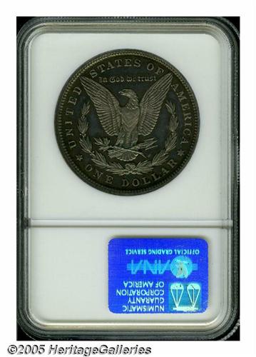 <B>1895<S$1> PR63 NGC.</B></I> In most 19th century series, a proof-only issue commands respect by completion oriented collectors whose numbers are relatively few, but for an immensely popular series like the Morgan Dollar respect soon expands into widespread, constant demand. It is interesting to go back 20-30 years and look at price projections from various experts in the Morgan Dollar series. Needless to say, the 1895 continues to defy the numismatic skeptics and perform admirably from an investment perspective.<BR> The specimen offered here displays considerably more eye appeal than the typical PR63. There is a modest degree of field-to-device contrast over moderately toned surfaces with abundant shadings of dove-gray and turquoise-blue patina that is somewhat deeper at the outer regions. Hairlines, while present, are certainly minimal for the assigned grade. A lovely specimen for the assigned grade and a coin that is certain to elicit much bidder attention.