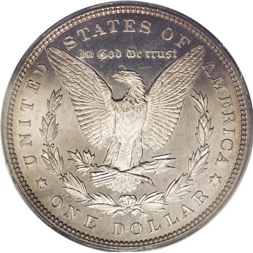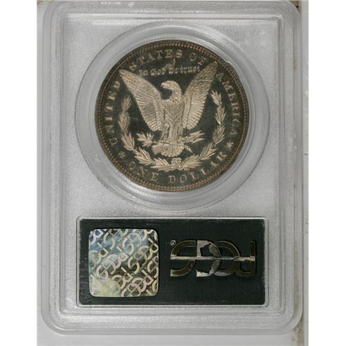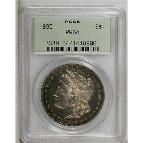 <B>1895<img border='0' src='http://www.heritagecoins.com/images/star.gif' width=10 height=10>$1> PR64 PCGS.</B></I> Medium apricot patina enriches both sides, while the left obverse margin shows slightly deeper champagne-rose toning. The strike is pinpoint-sharp with two minor exceptions: the highpoints of the curl directly above Liberty's ear, and the eagle's left (facing) claw. As expected of a proof, the denticles are squared off with little evidence of slope toward the field. The major devices exhibit moderate frost, and the piece could be considered a Cameo, although the early generation green label PCGS holder is from an era in third party certification that preceded the Cameo designation. Faint hairlines are customary for the PR64 level, but the reverse appears to pristine, and obverse hairlines are limited to the obverse margins at 3 and 9 o'clock. These only appear when the piece is rotated perpendicular to a light, and viewed beneath a strong loupe. Even then, they are inconsequential, and do not challenge the imposing eye appeal. The focal point of any Morgan dollar is the cheek. On the present near-Gem, the cheek is mark-free. In short, this is a splendid representative of this rare and desirable issue. The 1895 is the sole proof-only date in the series. Mint records indicate 12,000 pieces were struck, and circumstantial evidence is strong that these were in fact coined, rather than simply recorded as a bookkeeping entry. Where they went is subject to speculation, since no business strikes have been authenticated. Perhaps the entire mintage was simply bagged and stored, and eventually melted to fulfill the Pittman Act, along with over 270 million silver dollars of less rare vintage. Without any business strikes to collect, Morgan dollar enthusiasts must turn to the 880 proofs, which are far from sufficient to meet demand. Population: 57 in 64, 40 finer (9/06).