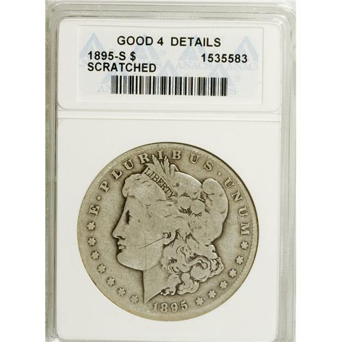 <B>1895-S $1 --Scratched--ANACS. Good 4 Details.</B></I> NGC Census: (40/2462). PCGS Population (26/1728). Mintage: 400,000. Numismedia Wsl. Price for NGC/PCGS coin in G4 : $220. (#7238)<BR><BR><b>Shipping:</b> Coins & Currency (<a target="_blank" href="http://www.heritageauctions.com/common/shipping.php">view shipping information</a>)