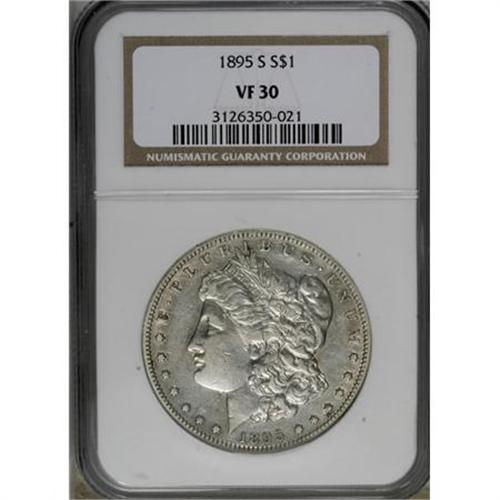 <B>1895-S $1 VF30 NGC.</B></I> NGC Census: (43/951). PCGS Population (62/1561). Mintage: 400,000. Numismedia Wsl. Price for NGC/PCGS coin in VF30: $590. (#7238)<BR><BR><B>Coin Engraver:</B> George T. Morgan<BR><BR><b>Shipping:</b> Coins & Currency (<a target="_blank" href="http://www.heritageauctions.com/common/shipping.php">view shipping information</a>)