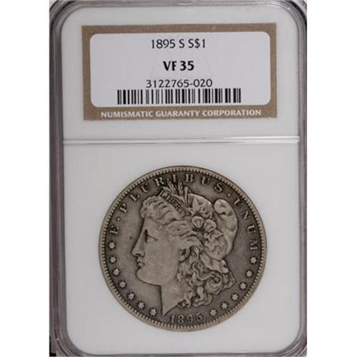 <B>1895-S $1 VF35 NGC.</B></I> This luminous Choice VF piece shows subtle blue-gray, heather, and tan shadings over each side. Aside from two small digs before the bridge of Liberty's nose, the surfaces show no overt marks.<BR><BR><B>Coin Engraver:</B> George T. Morgan<BR><BR><b>Shipping:</b> Coins & Currency (<a target="_blank" href="http://www.heritageauctions.com/common/shipping.php">view shipping information</a>)