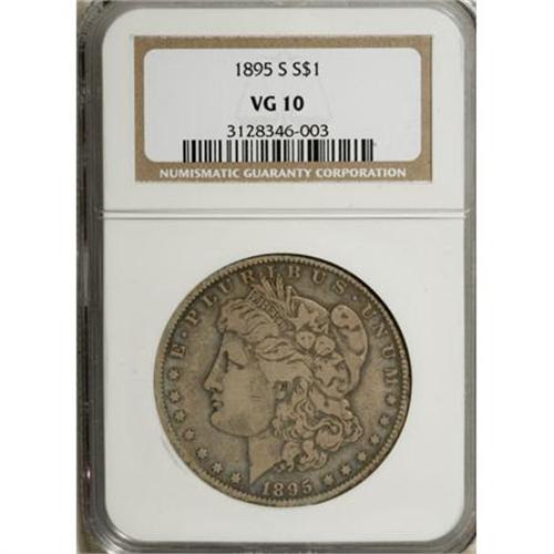 <B>1895-S $1 VG10 NGC.</B></I> . NGC Census: (20/1095). PCGS Population (45/1783). Mintage: 400,000. Numismedia Wsl. Price for NGC/PCGS coin in VG10: $368. (#7238)<BR><BR><B>Coin Engraver:</B> George T. Morgan<BR><BR><b>Shipping:</b> Coins & Currency (<a target="_blank" href="http://www.heritageauctions.com/common/shipping.php">view shipping information</a>)