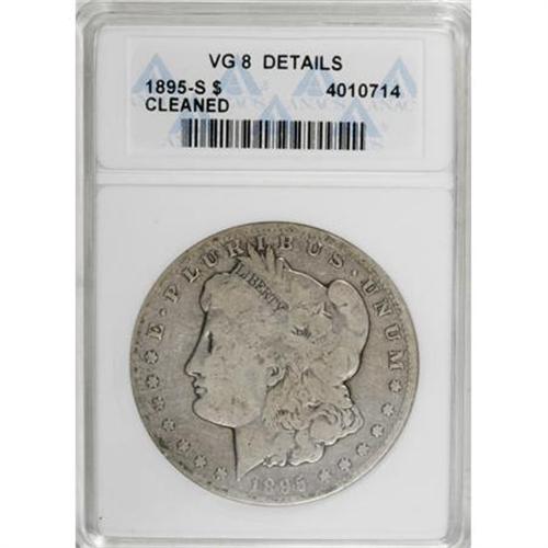 <B>1895-S $1 --Cleaned--ANACS. VG8 Details.</B></I> NGC Census: (23/1085). PCGS Population (35/1748). Mintage: 400,000. Numismedia Wsl. Price for NGC/PCGS coin in VG8 : $350. (#7238)<BR><BR><B>Coin Engraver:</B> George T. Morgan<BR><BR><b>Shipping:</b> Coins & Currency (<a target="_blank" href="http://www.heritageauctions.com/common/shipping.php">view shipping information</a>)