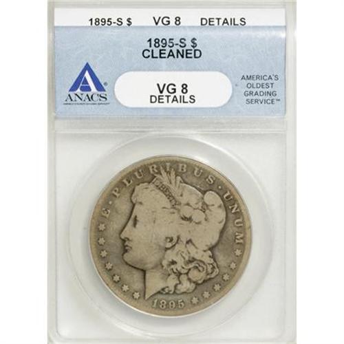 <B>1895-S $1 --Cleaned--ANACS. VG8 Details.</B></I> NGC Census: (24/1099). PCGS Population (37/1772). Mintage: 400,000. Numismedia Wsl. Price for NGC/PCGS coin in VG8 : $350. (#7238)<BR><BR><B>Coin Engraver:</B> George T. Morgan<BR><BR><b>Shipping:</b> Coins & Currency (<a target="_blank" href="http://www.heritageauctions.com/common/shipping.php">view shipping information</a>)
