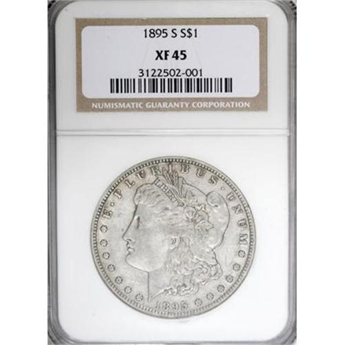 <B>1895-S $1 XF45 NGC.</B></I> NGC Census: (82/764). PCGS Population (91/1275). Mintage: 400,000. Numismedia Wsl. Price for NGC/PCGS coin in XF45: $1,003. (#7238)<BR><BR><B>Coin Engraver:</B> George T. Morgan<BR><BR><b>Shipping:</b> Coins & Currency (<a target="_blank" href="http://www.heritageauctions.com/common/shipping.php">view shipping information</a>)