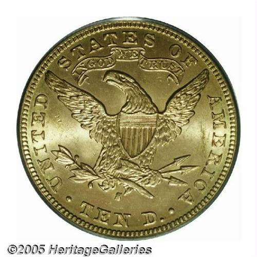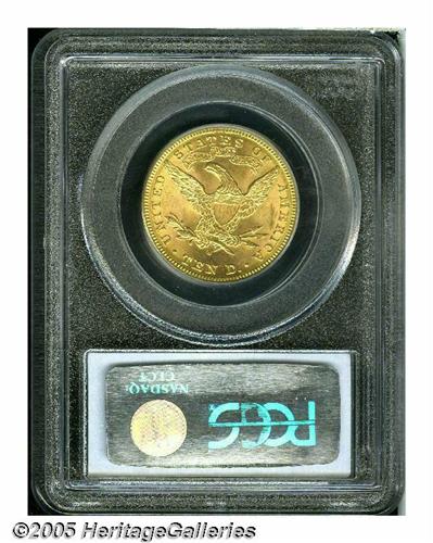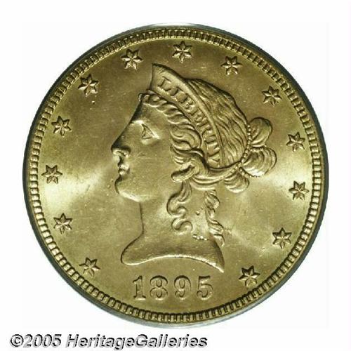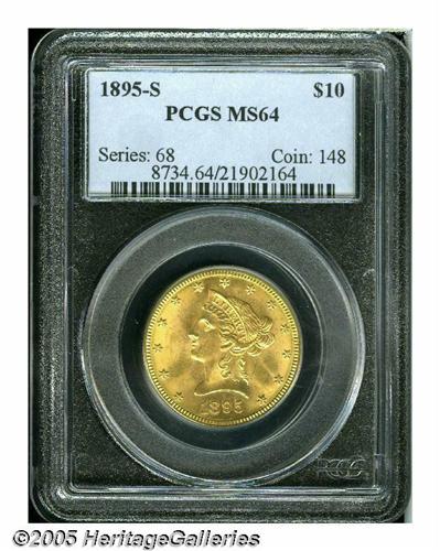 <B>1895-S<$10> MS64 PCGS.</B></I> A conditionally rare and often overlooked issue, the '95-S is a significant collector coin in AU condition, and Mint State pieces are seldom seen. In near-Gem condition, this is one of the most important individual coins known from the 1890s. This coin is nearly unchallenged as the finest known with a total population of 5 coins in MS64, 2 are finer (4/05) at both services combined. This is a splendid coin. The fields have a satiny glimmer that intensifies the green-golden surfaces. Each side is virtually unmarked, the most obvious surface blemish being a milling mark on Liberty's lower neck. For the gold specialist.