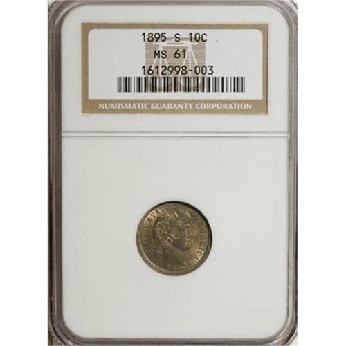 <B>1895-S 10C MS61 NGC.</B></I> NGC Census: (6/58). PCGS Population (3/75). Mintage: 1,120,000. Numismedia Wsl. Price for NGC/PCGS coin in MS61: $560. (#4808)<BR><BR><B>Coin Engraver:</B> Charles E. Barber<BR><BR><b>Shipping:</b> Coins & Currency (<a target="_blank" href="http://www.heritageauctions.com/common/shipping.php">view shipping information</a>)