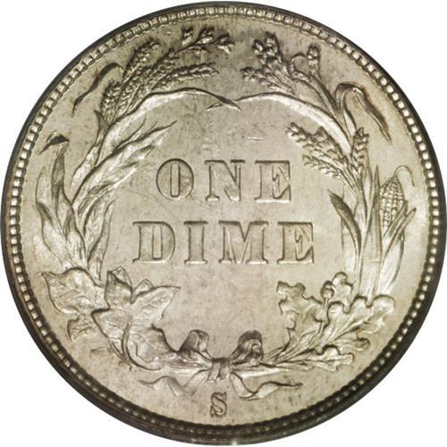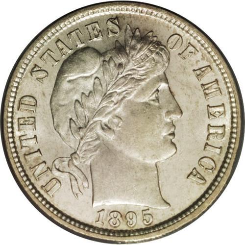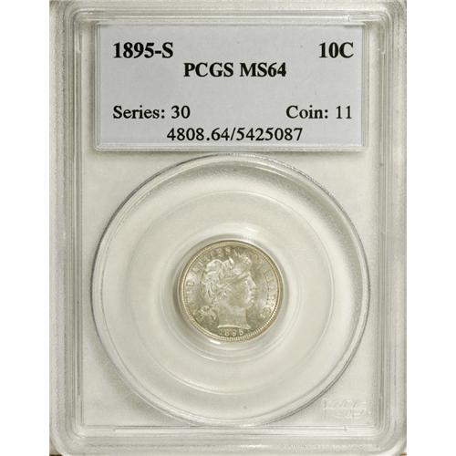 <B>1895-S 10C MS64 PCGS.</B></I> A penetrating struck and lustrous pearl-gray near-Gem that has a clean obverse field and a few unimportant ticks above the N in ONE. A pair of faint marks on the portrait are imperceptible to the unaided eye. Very scarce at the MS64 level. Population: 18 in 64, 5 finer (9/06).<BR><I>Ex: Strong Museum (Stack's, 10/01), lot 354.</B></I><BR><I>From The Jones Beach Collection.</B></I><BR><BR><b>Shipping:</b> Coin/Currency (<a target="_blank" href="http://www.heritageauctions.com/common/shipping.php">view shipping information</a>)
