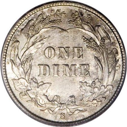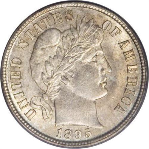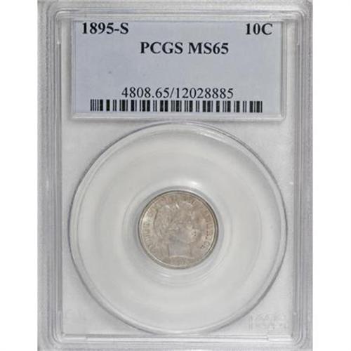 <B>1895-S 10C MS65 PCGS.</B></I> The 1895-S dime is difficult to locate in Gem-quality grades, as can be determined by the PCGS/NGC population figures, that show only 11 such examples having been certified. Dusky light gray patina with blushes of powder-blue occupies the lustrous surfaces of this MS65 coin. Well struck throughout, and no significant contact marks. Population: 4 in 65, 2 finer (11/07).<BR><BR><B>Coin Engraver:</B> Charles E. Barber<BR><BR><b>Shipping:</b> Coins & Currency (<a target="_blank" href="http://www.heritageauctions.com/common/shipping.php">view shipping information</a>)
