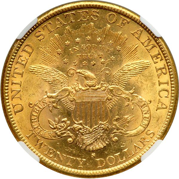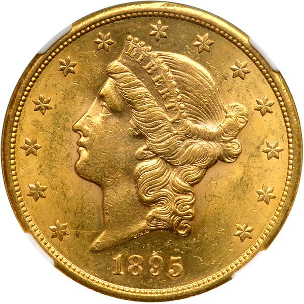 1895-S $20 Liberty. NGC graded MS-60 PQ. Lovely golden toning atop lustrous surfaces (PCGS # 9028) .