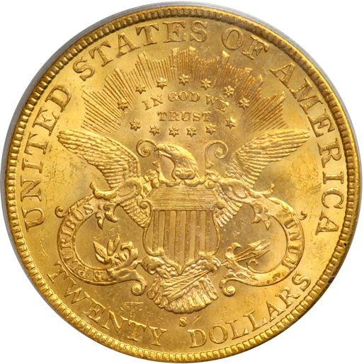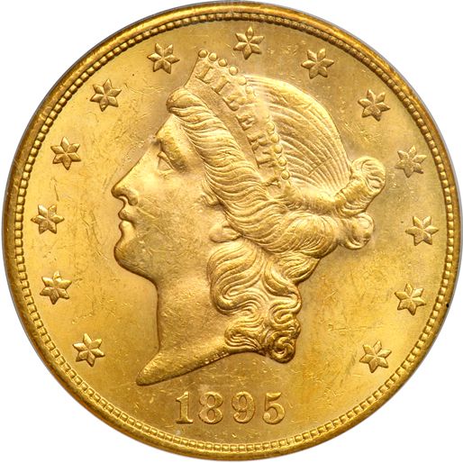 1895-S $20 Liberty. PCGS graded MS-63. A frosty, well struck example displaying attractive warm golden luster (PCGS # 9028) .
