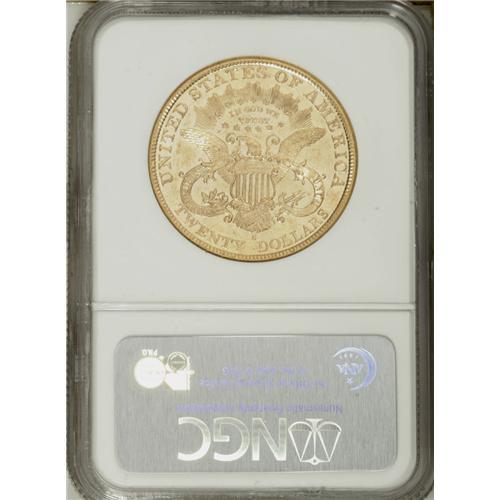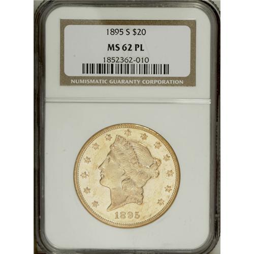 <B>1895-S $20 MS62 Prooflike NGC.</B></I> This flashy and sharply struck double eagle was presumably among the first pieces produced from a freshly installed pair of dies. A moderate mark each on the obverse rim and Liberty's neck is consistent with the MS62 grade. Census: 2 in 62 Prooflike, 0 finer (10/06).<BR><BR><b>Shipping:</b> Coin/Currency (<a target="_blank" href="http://www.heritageauctions.com/common/shipping.php">view shipping information</a>)