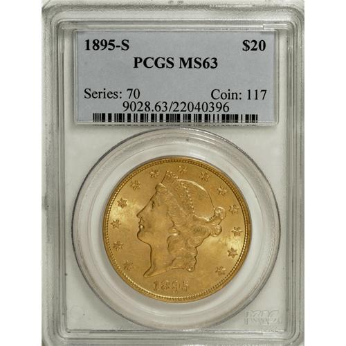 <B>1895-S $20 MS63 PCGS.</B></I> An attractive Mint State piece, this lovely double eagle has frosty yellow luster with only a few scattered marks on the high points, including a small blemish on Liberty's jaw.<BR><BR><b>Shipping:</b> Coins & Currency (<a target="_blank" href="http://www.heritageauctions.com/common/shipping.php">view shipping information</a>)