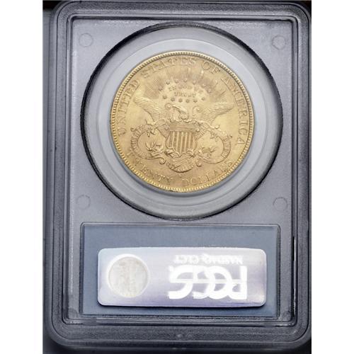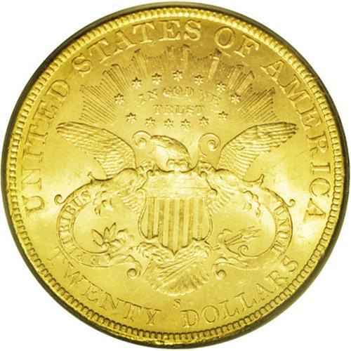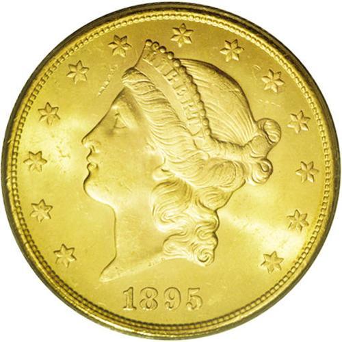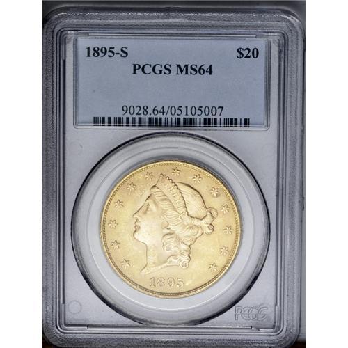 <B>1895-S<$20> MS64 PCGS.</B></I> An attentively struck and expectantly lustrous olive-gold near-Gem. The surfaces are unblemished aside from a brief reeding mark on the field near the forehead. The 1895-S appears frequently in bagmarked Mint State, but MS64 examples are elusive. PCGS and NGC combined have certified a mere 14 pieces finer, as of (6/06).