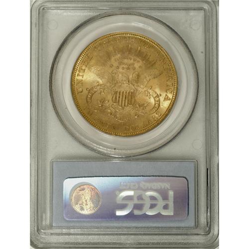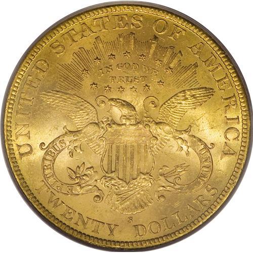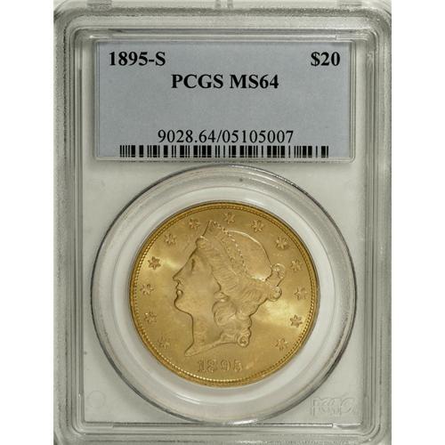 <B>1895-S $20 MS64 PCGS.</B></I> An attentively struck and expectantly lustrous olive-gold near-Gem. The surfaces are unblemished aside from a brief reeding mark on the field near the forehead. The 1895-S appears frequently in bagmarked Mint State, but MS64 examples are elusive. Population: 121 in 64, 5 finer (3/07).<BR><BR><b>Shipping:</b> Coins & Currency (<a target="_blank" href="http://www.heritageauctions.com/common/shipping.php">view shipping information</a>)