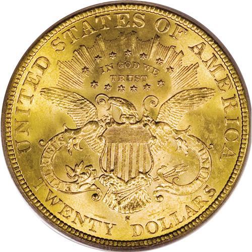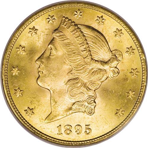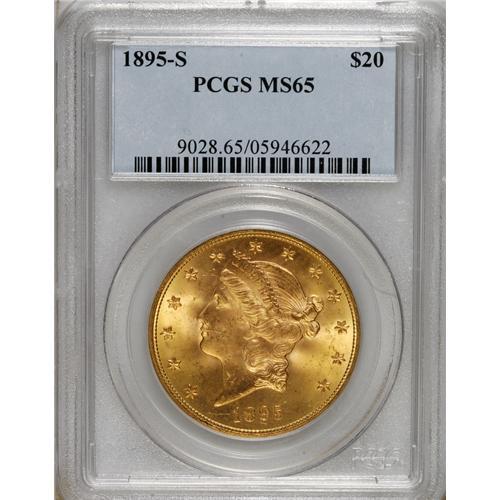 <B>1895-S $20 MS65 PCGS.</B></I> Like so many of the late-19th century S-mint Liberty Head double eagle issues, the 1895-S is readily available up through MS62 and MS63 grades, and yet it is highly elusive any finer. In MS64 the number of survivors dwindles to only a few dozen coins, and in MS65 this piece is one of only six so graded at PCGS, with none finer, while another eight Gems are certified at NGC, with one finer (3/07). Both sides offer beautifully lustrous apricot-gold surfaces that show minimal and undistracting abrasions. The well-executed strike is responsible for bold if not completely full details on Liberty's highpoint hair and the star centrils.<BR><BR><b>Shipping:</b> Coins & Currency (<a target="_blank" href="http://www.heritageauctions.com/common/shipping.php">view shipping information</a>)