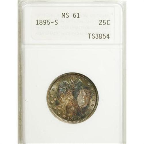 <B>1895-S 25C MS61 ANACS.</B></I> NGC Census: (4/49). PCGS Population (4/51). Mintage: 1,764,681. Numismedia Wsl. Price for NGC/PCGS coin in MS61: $483. (#5612)<BR><BR><B>Coin Engraver:</B> Charles E. Barber<BR><BR><b>Shipping:</b> Coins & Currency (<a target="_blank" href="http://www.heritageauctions.com/common/shipping.php">view shipping information</a>)