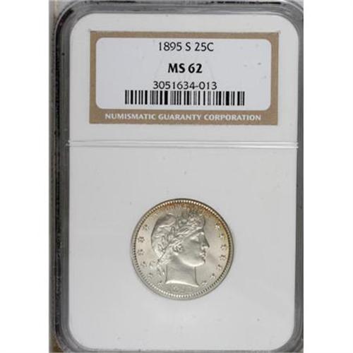 <B>1895-S 25C MS62 NGC.</B></I> NGC Census: (5/43). PCGS Population (14/37). Mintage: 1,764,681. Numismedia Wsl. Price for NGC/PCGS coin in MS62: $585. (#5612)<BR><BR><B>Coin Engraver:</B> Charles E. Barber<BR><BR><b>Shipping:</b> Coins & Currency (<a target="_blank" href="http://www.heritageauctions.com/common/shipping.php">view shipping information</a>)