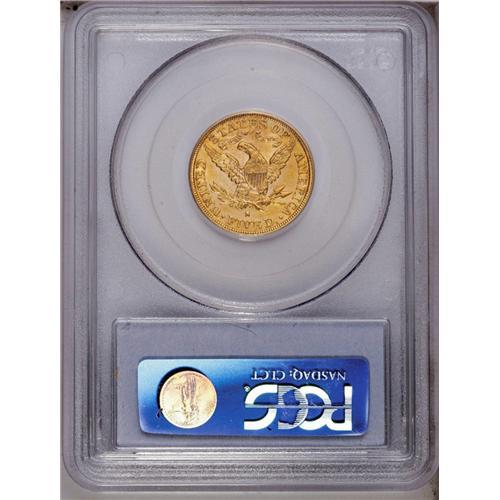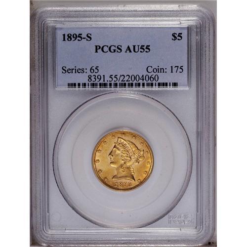 <B>1895-S<$5> AU55 PCGS.</B></I> A better date five with substantial luster and bright reddish-gold color. Liberty's hair has a hint of striking softness, but the devices are generally bold. Only 112,000 pieces were struck, and the 1895-S is among the most difficult later issues to procure in Uncirculated grades. <BR><BR><B>Important notice:</B> Heritage usually auctions material at the rate of 200-250 lots per hour. On some occasions eBay Live bid software or the Internet may not be able to keep up with the pace of the auction. We recommend placing a realistic absentee bid now as insurance to avoid disappointment. Occasionally the auctioneer may eliminate or reject an eBay Live bid, and the auctioneer may also reopen a lot after the close of the eBay live bidding (usually because we missed an audience bid), and may reject your bid even if it shows you as the winning bidder. By bidding via eBay Live, you agree that Heritage may award the lot to another bidder at its sole discretion under the circumstances described above or any other reasonable circumstances. Since eBay bids are not shown to us until we open the lot on the floor, we treat those bids just like floor bids. In most cases the floor responds before the eBay bid is presented to us, due to Internet lag time, so for consistency we have made it a policy that floor bids are always considered first over tie eBay live bids. Also please note that all Heritage lots purchased through eBay Live carry a 20% Buyer's Premium. Please make sure you read the Terms and Conditions before you bid. This lot is being auctioned in conjunction with a live floor auction by Heritage Galleries & Auctioneers. All final auction and invoice information will be supplied by Heritage Galleries & Auctioneers, and all other information should be considered preliminary. Lot:2838 <BR><BR><B>Winning Notification and Billing:</B> After the FINAL session in this auction is complete, Heritage will send e-mail and snail mail invoices. This process normally takes several days. All final auction and invoice information will be supplied by Heritage Galleries & Auctioneers, and all other information should be considered preliminary. <BR><BR>This auction will be conducted on a live auction floor and over the Internet through eBay Live. If you choose to place an absentee bid, please take a moment to <font color='#0000ff'><u><a href='http://pages.ebay.com/liveauctions/help/before/laabsentee.html'>learn how eBay Live absentee bidding works</a></u></font><font color='#000000'>