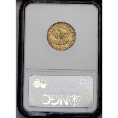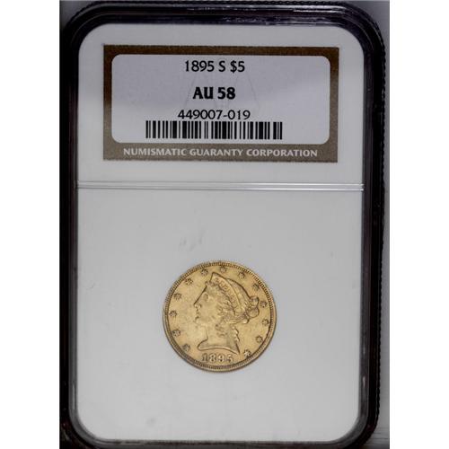 1895-S $5 AU58 NGC. A typically struck and still-lustr