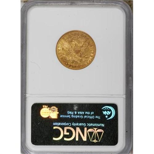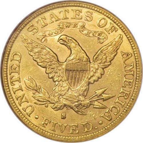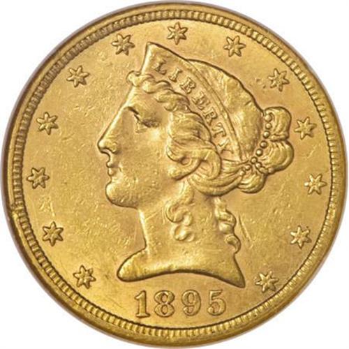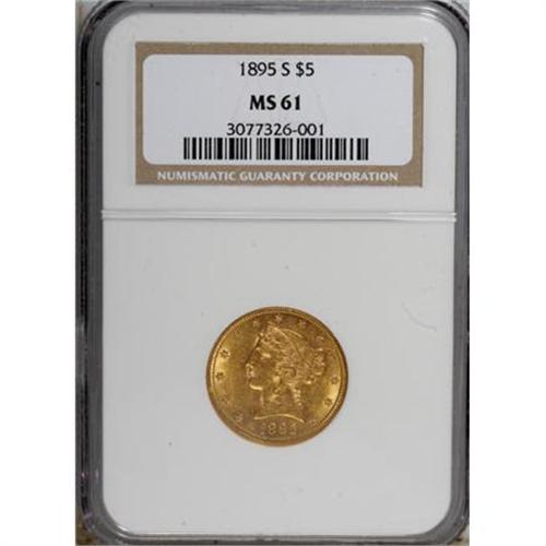 <B>1895-S $5 MS61 NGC.</B></I> In spite of the rather unimpressive mintage of 112,000 pieces, there are few high grade 1895-S fives known today. Apparently most entered circulation shortly after minting the majority of known examples are in the XF-low AU grade range. This is one of the few Uncirculated examples known. Only 11 others have been so graded by NGC with seven finer (6/07). Well, but not fully struck, there is a bit of highpoint softness evident on the design elements on each side. Lightly abraded for the most part, the only significant mark is located in the field behind the neck of Liberty. Good luster with attractive orange-gold color.<BR><BR><B>Coin Engraver:</B> Christian Gobrecht<BR><BR><b>Shipping:</b> Coins & Currency (<a target="_blank" href="http://www.heritageauctions.com/common/shipping.php">view shipping information</a>\)