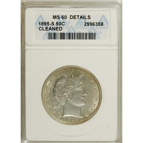 <B>1895-S 50C --Cleaned--ANACS. MS60 Details.</B></I> NGC Census: (0/70). PCGS Population (1/88). Mintage: 1,108,086. Numismedia Wsl. Price for NGC/PCGS coin in MS60: $467. (#6473)<BR><BR><B>Coin Engraver:</B> Charles E. Barber<BR><BR><b>Shipping:</b> Coins & Currency (<a target="_blank" href="http://www.heritageauctions.com/common/shipping.php">view shipping information</a>\)