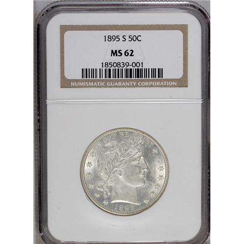 <B>1895-S<50C> MS62 NGC.</B></I> Sharply struck with soft luster. The peach-silver surfaces have a variety of small marks that partly account for the grade. Census: 19 in 62, 36 finer (7/06).